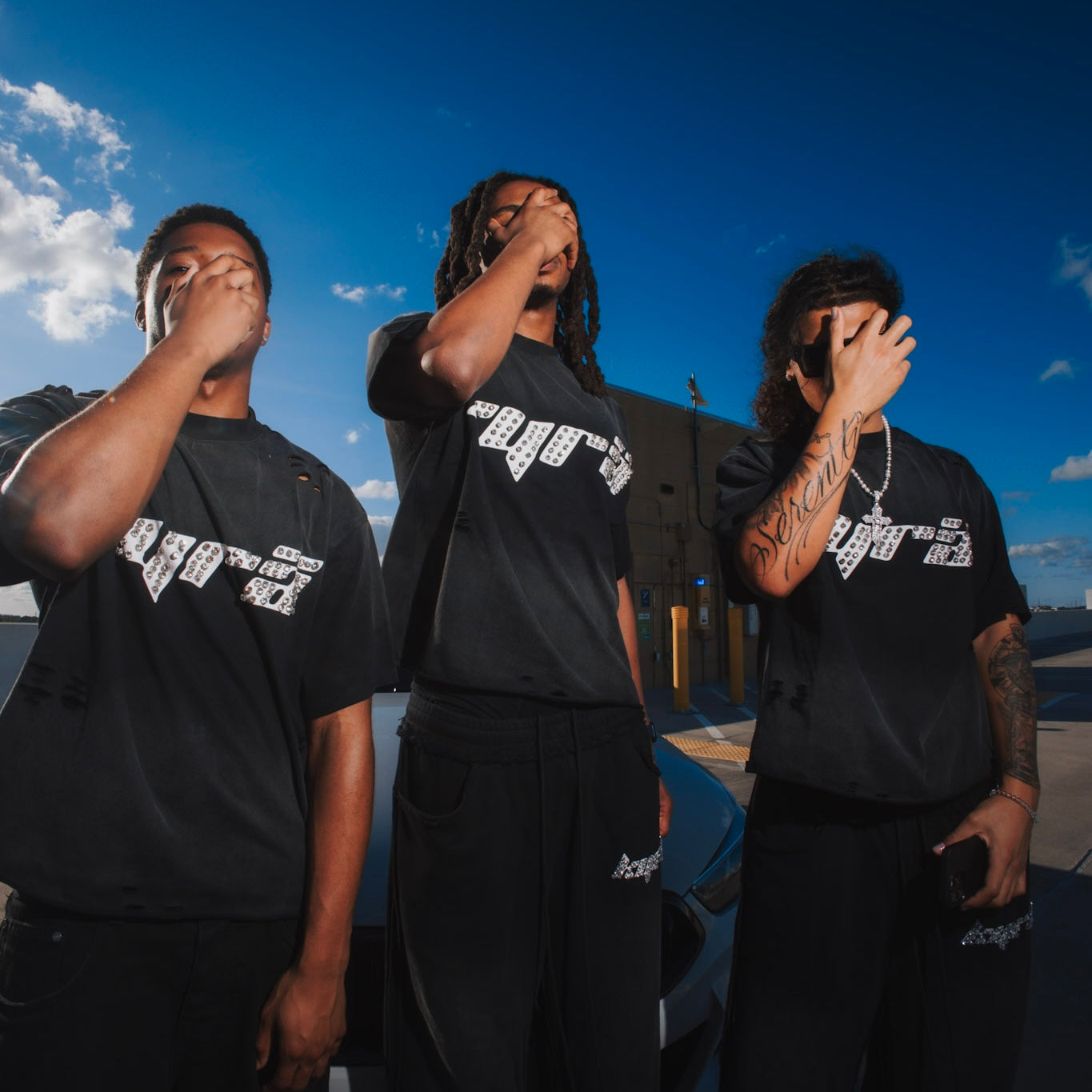 Finished with screen-printed detailing accented by 3D rhinestones, this design captures KYRÄ’s essence — luxury streetwear rooted in authenticity.