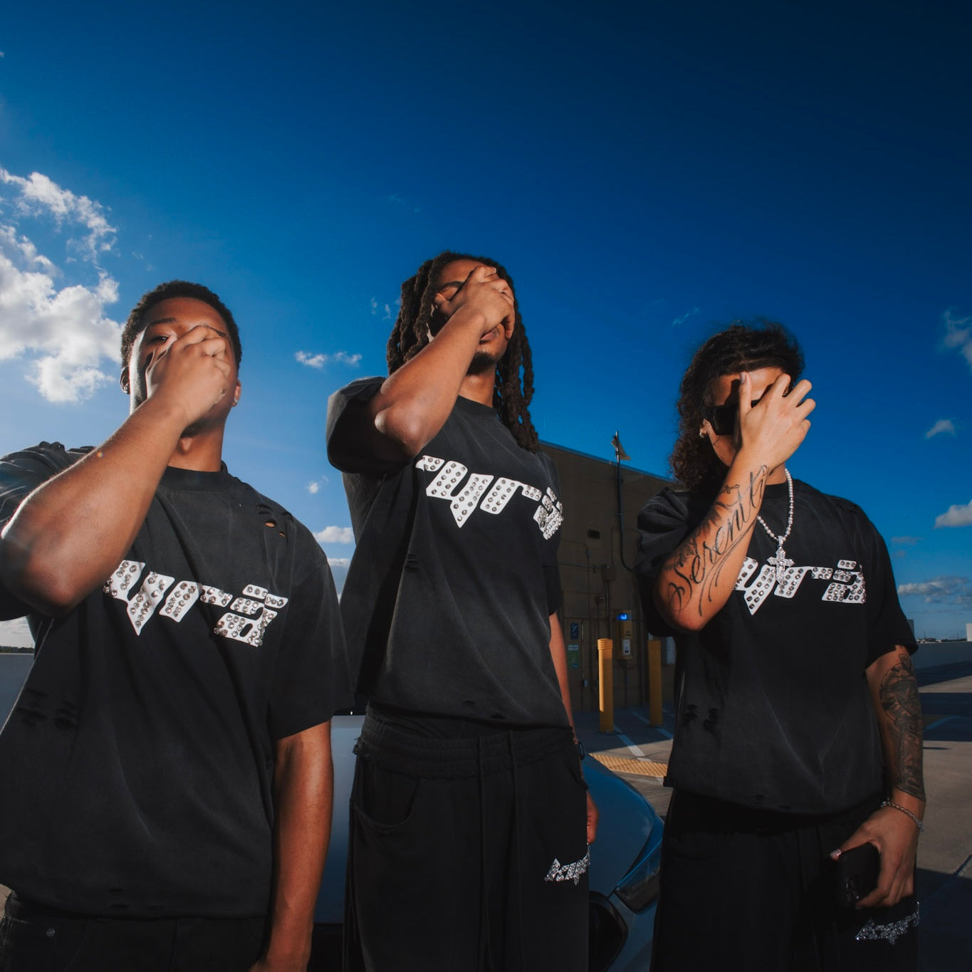 Designed with intentional distressing and an open hem cropped fit, this tee embodies KYRA’s balance between raw edge and refined minimalism. The screen-printed KYRA logo, finished with 3D rhinestones, adds a subtle touch of luxury that catches light and attention.
