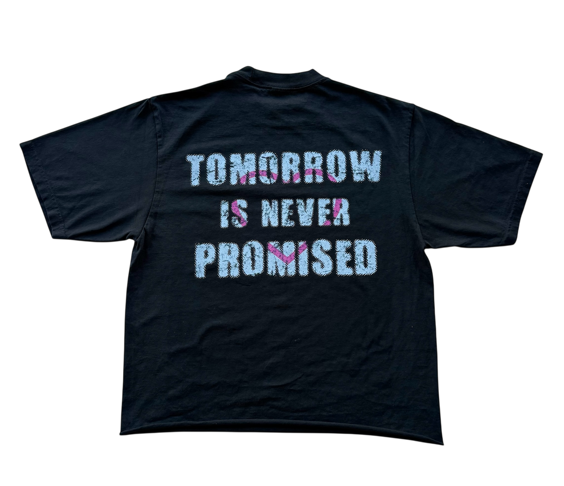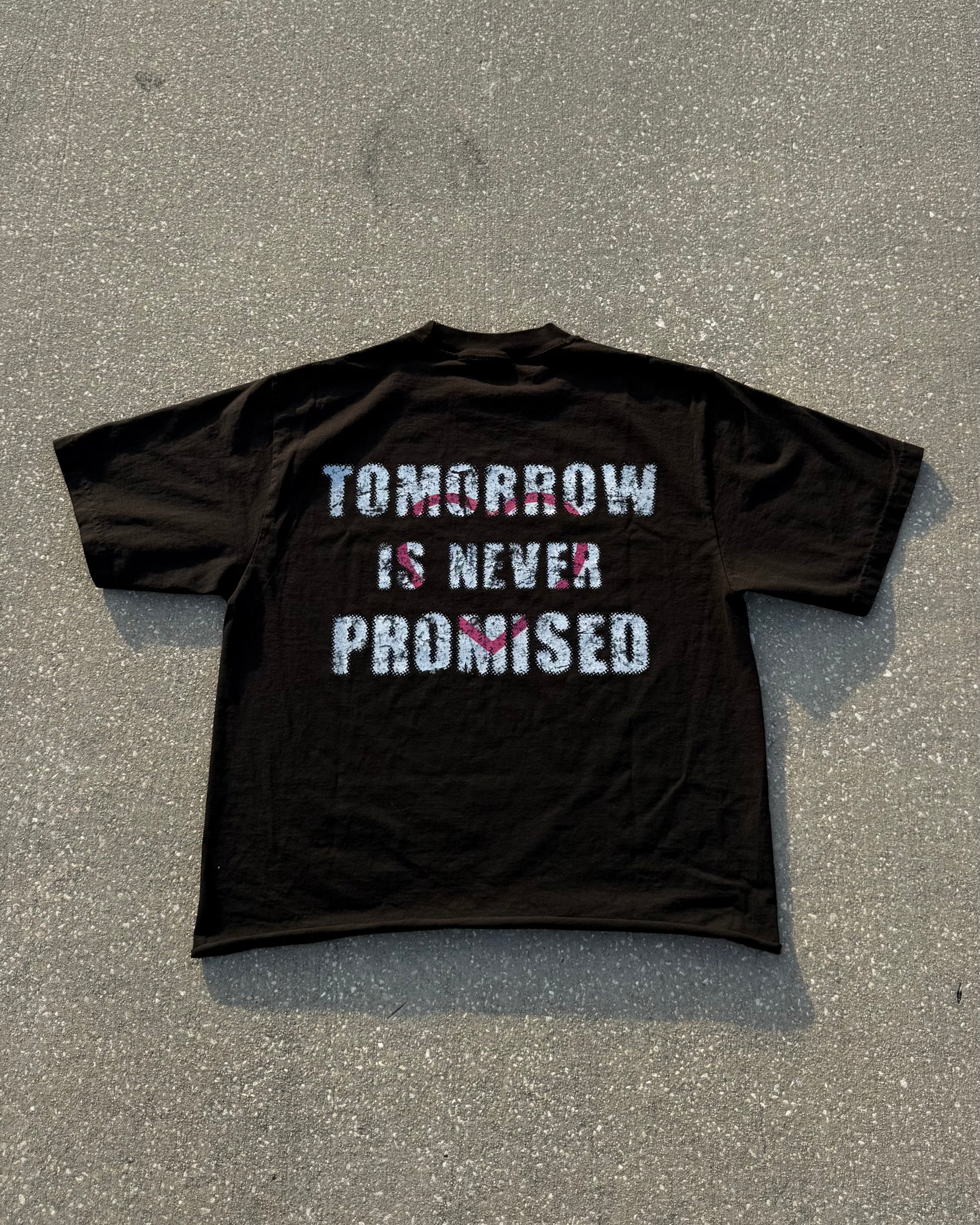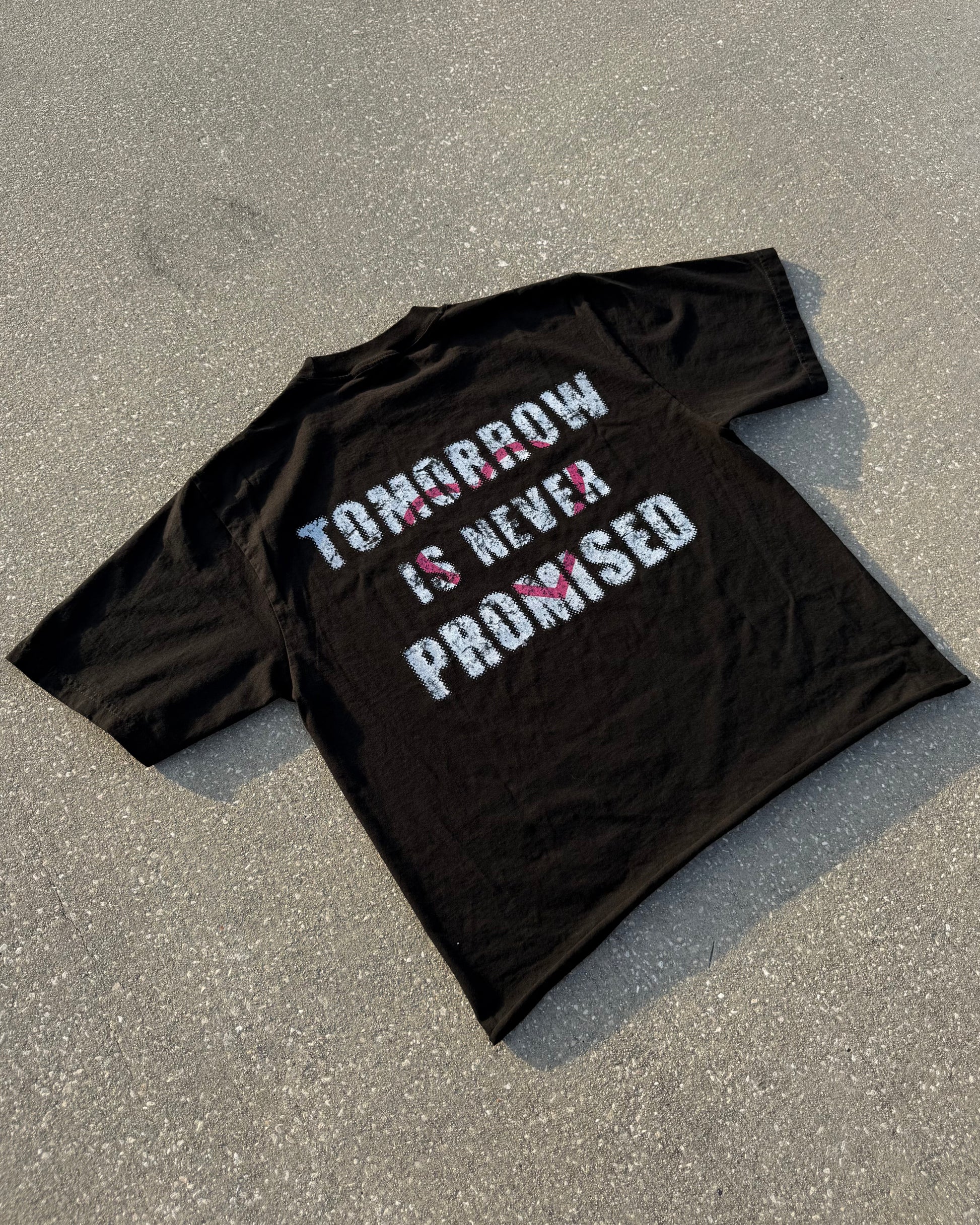 The back graphic, “Tomorrow Is Never Promised,” paired with a single heart stamped across the message, reinforces the deeper narrative. It’s a call to appreciate the present, value your people today, and move with intention in every choice you make.